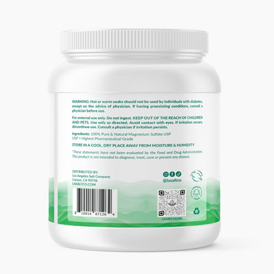 Dissolve two cups of Epsom Salt under warm, running bath water and soak for 20 minutes. For best results, maintain bath water at a warm temperature of 101–103 °F (39 °C) — not hot — to support effective absorption. Excessive heat may cause the skin to release rather than absorb minerals.