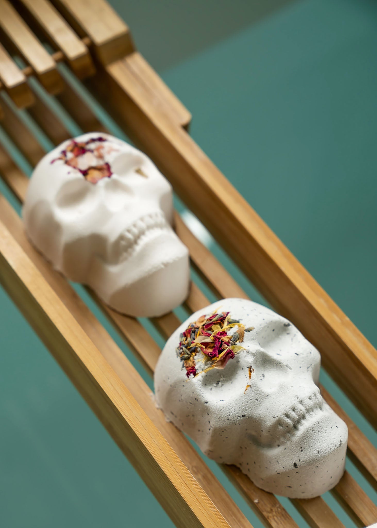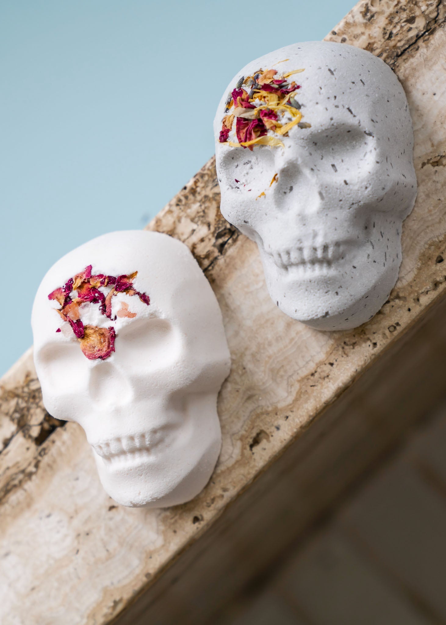 The Nirvana Crystal Skull Bath Bomb is handmade with skin-soothing Himalayan pink salt and infused with our signature seasonal scents to melt away stress and awaken the senses. Each spooky-chic bomb is topped with glittering pink salt crystals and freshly dried rose petals, making it as beautiful as it is indulgent. This fall-inspired fragrance blends sweet orange, patchouli, and rose with warm spice notes for the perfect seasonal soak. Hidden inside, a mystery crystal—energy-cleansed and ready to keep—adds a playful surprise to your self-care ritual.